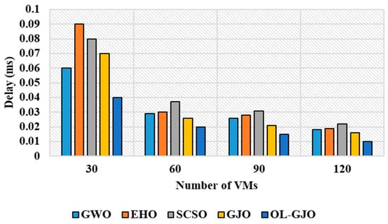 The experimental results in Table 9 exhibit that OL-GJO results in minimal delay when compared with the existing M-PSO and auction-based approaches. For instance, when the number of tasks is assigned as 200, the delay experienced by OL-GJO is 2.95 ms, whereas M-PSO and the auction-based approach experienced delays of 7.19 ms and 3.78 ms, respectively. Similarly, the evaluation of delay is performed for different numbers of VMs: 30, 60, and 90. The evaluation of delay based on the number of VMs is presented in Table 10.