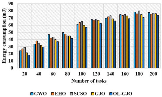 The experimental outcome attained from Table 5 and Table 6 present the results achieved while evaluating energy consumption for different counts of tasks and VMs, respectively. Task counts range from 20 to 200, and the number of VMs ranges from 30 to 120. For example, the energy consumption of OL-GJO for 200 tasks is 73.98 mJ, whereas existing methods like GWO, EHO, SCSO, and GJO consume energy of 77.90 J, 75.41 J, 76.84 J, and 76.09 J, respectively. The superior performance of OL-GJO is due to the incorporation of opposition-based learning in GJO, which helps assign tasks to IoT-based edge resources with minimal computational time. The assignment of tasks with minimal computational time helps to minimize energy consumption compared to other methods.