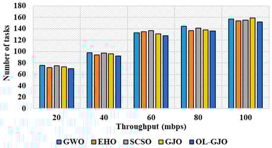 In this sub-section, the evaluation is performed based on different throughputs for the number of tasks. M-PSO is used to evaluate the efficacy of OL-GJO, and the attained experimental results are presented in Table 11.