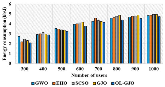 The experimental outcomes from Table 8 and Figure 8 exhibit that OL-GJO obtained better energy efficiency than existing state-of-the-art algorithms. For instance, when the number of users is 1000, the energy consumption of OL-GJO is 4.73 kb/J, which is comparatively lower than existing methods such as GWO, EHO, SCSO, and GJO, which have energy consumption values of 4.84 kb/J, 4.88 kb/J, 4.98 kb/J, and 4.97 kb/J, respectively. The improved result of OL-GJO is due to the opposition-based learning incorporated into GJO, which helps assign tasks to VMs in a minimal time period, resulting in reduced energy consumption.