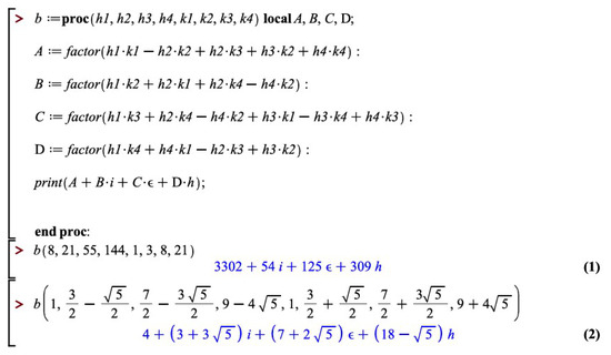 The below Maple code is written and presented to find the multiplication of and . Here, the desired product is obtained by typing the coefficients of h and k, respectively, in procedure b. For example, the number (1) in Figure 1 is the multiplication of and . Similarly, number(2)equals .