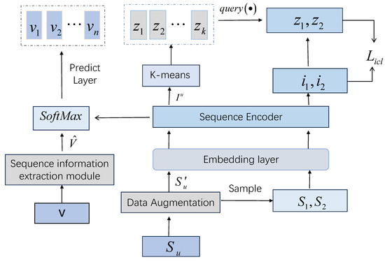 Then, the output is clustered using K-means to obtain the intent prototype representation , where k denotes the number of user intent types. A sequence is randomly selected from the augmented sequence set, and a sequence , which shares the same target item, is selected as the positive sample. The interest representations and of these two sequences are obtained through the embedding layer and the sequence encoder. Then, the nearest intent prototypes and are selected from the intent prototypes to match and The formula is as follows: