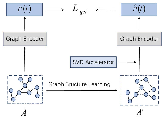 Here, the perturbation strength is denoted as , and the fully learnable perturbation graph is represented as . This approach belongs to the direct method of graph structure modeling in graph-based learning. Then, the graph encoder [31] is used to generate graph representations, obtaining both the original representation and the refined graph representation .