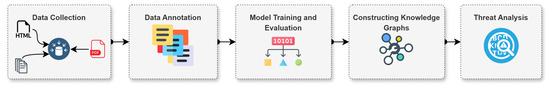 This study introduces a comprehensive system for cyber threat intelligence (CTI), designed to handle the complete process—from extracting information from unstructured text to performing detailed analyses of the extracted data. The primary objective of the proposed system is to automate the processing of critical information embedded in security threat reports and related content, convert it into a structured format, extract actionable insights, and facilitate efficient analysis. The system’s overall architecture is centred around the components illustrated in Figure 1.