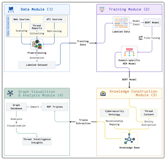 The proposed approach, illustrated in Figure 2, is described as a sequential pipeline representing our cyber threat intelligence work. These modules are the data module, the training module, the knowledge construction module, and the graph analysis module. The following subsections provide detailed explanations of each module.
