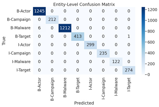 The following sentence demonstrates how the IOB tagging scheme is applied in a cybersecurity context: “The APT29 group used the malware SUNBURST in a campaign targeting U.S. government agencies”. In the annotation process, entities such as threat actors, malware, campaigns, and targets were annotated as shown in Table 3.