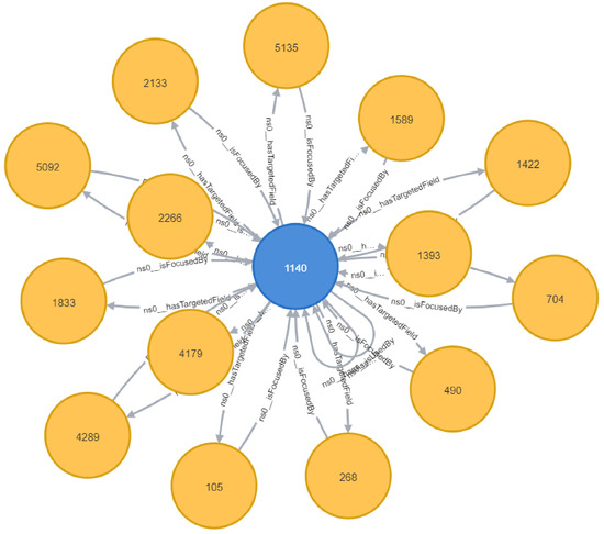 According to the results in Table 10, the malware with a node ID value of 2168 attacked 19 different targets, while the malware with a node ID value of 1140 attacked 14 different targets. A sample graph for the malware with a node ID value of 1140 is shown in Figure 6.