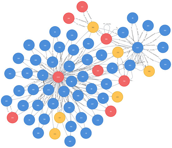 The Adamic/Adar index evaluates the popularity of common connections inversely on a logarithmic scale, giving higher weight to rarer connections. The results of the analysis in Table 14 show a score of 2.71 and 10 common connections for all potential targets. Among the critical infrastructure targets, SSH services and airports stand out, while civil sector targets such as gaming, cafes, and sports are also noteworthy. Both analyses produced complementary results. While the common neighbours analysis identified the threat actor’s basic target profile, the Adamic/Adar index provided a more sophisticated assessment of this profile. The PageRank value (47.48) shown in Table 11 confirms the central position of the actor with node ID 5141 in the analysed threat reports, as shown in the graph representation in Figure 7.