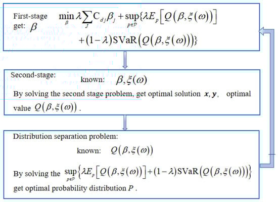 Based on the aforementioned analysis, this study proposes a data-driven two-stage distributionally robust optimization approach to address location problems under uncertainties in both transportation costs and demand, integrating mean semi-variance risk measures with mixed-integer programming techniques. When solving two-stage distributionally robust optimization problems, two predominant algorithmic approaches are typically employed: decomposition algorithms [,,] and distribution separation algorithms [,,]. This study proposes an innovative distribution separation technique to construct a solution framework, overcoming the duality transformation challenges caused by integer-constrained first-stage decision variables and semi-variance risk measures.