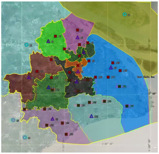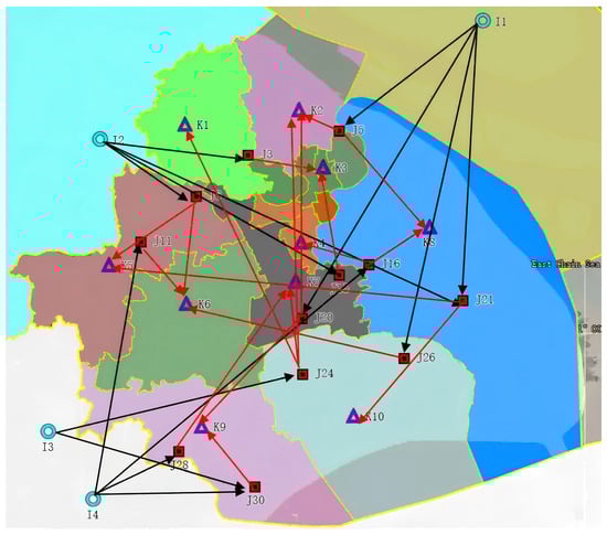 Figure 3 illustrates the supply chain network for location allocation, with detailed results presented in Table 5. To maximize customer satisfaction, the enterprise selects , , , , , , , , , , and as distribution centers to supply fresh products to customers. Under this configuration, the supply chain achieves a maximum profit of CNY . The expected demand of demand area is , and the distribution is completed by distribution center . The expected demand of demand area is , which is provided by , and , with , and , respectively The expected demand of demand area is , which is provided by and , with and , respectively. The expected demand of demand area is , and the distribution is completed by distribution center . The expected demand of demand area is , which is provided by and , with and , respectively. The expected demand of demand area is , which is provided by , and , with , and , respectively. The expected demand of demand area is , which is provided by and , with and , respectively. The expected demand of demand area is , which is provided by and , with and , respectively. The expected demand of demand area is , which is provided by and , with and , respectively. The expected demand of demand area is , and the distribution is completed by distribution center . At the same time, it can be seen from Figure 3 that the location of the selected distribution center is relatively close to the suppliers and demand areas, meeting the principle of nearby supply.