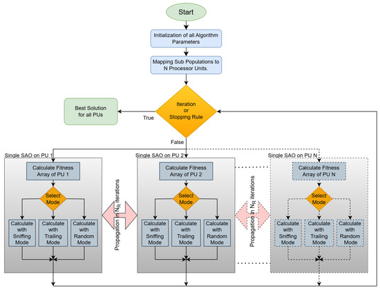 The flowchart in Figure 1 analyzes the operation of a parallel implementation of the SAO algorithm, which utilizes multiple processing units (PUs) to accelerate the discovery of optimal solutions for complex problems. The process begins with the systematic initialization of controlled parameters, including population size, number of subpopulations, convergence coefficients, etc. Subsequently, the main population is partitioned into N distinct subpopulations, assigned to independent PUs. This decentralized architecture enables the simultaneous exploration of multiple search subspaces, aiming to maximize solution diversity and minimize the risk of entrapment in local optima. Each PU independently executes a sequence of computational steps in every iteration. First, a fitness array is calculated, quantifying the performance of each candidate solution based on the problem’s objective function. Next, the positions of the solutions are updated through three distinct operational modes: