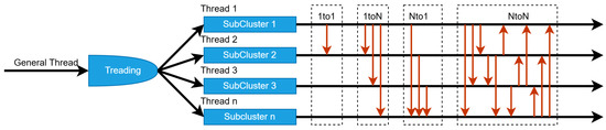 The image in Figure 2 illustrates the parallelization of the SAO method and the information dissemination strategies among subpopulations. Each thread (Thread 1, 2, …, N) corresponds to an independent PU managing a subpopulation (SubCluster 1, 2, …, N). Each subpopulation operates in parallel, exploring distinct regions of the search space, while simultaneously exchanging information with other subpopulations via predefined strategies, as explained in Section 2.3. A core dissemination strategy is 1to1 (one-to-one), where a randomly selected subpopulation sends a specific number of optimal solutions (e.g., locally optimal positions) to another randomly chosen subpopulation. This exchange occurs periodically or under predefined conditions to enhance solution diversity and avoid convergence to local optima. For instance, if SubCluster 1 discovers a high-quality solution, transmitting it to SubCluster 3 could accelerate global convergence. Beyond 1to1, other strategies may be applied, such as NtoN (all-to-all), where all subpopulations exchange information simultaneously. In all cases, the dissemination of optimal solutions serves as a cooperative optimization mechanism. Even if a subpopulation becomes trapped in a local optimum, the introduction of external solutions through dissemination can “free” it. Additionally, the randomization in subpopulation selection (as in 1to1) ensures the process remains dynamic and adaptable. This combination of parallel execution and strategic information sharing improves the SAO method’s efficiency, particularly in large-scale or non-linear optimization problems by balancing exploration and exploitation while mitigating computational stagnation.