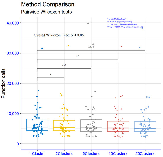 In Figure 3, the statistical results from the comparison of different numbers of subpopulations for the critical parameter p, which represents levels of statistical significance, indicate significant differences between the groups. Specifically, the comparison between one subpopulation (1 Cluster) and two subpopulations (2 Clusters) yielded a p-value of 0.037, which is below the conventional significance threshold of 0.05, demonstrating statistically significant differences. The differences intensify as the number of subpopulations increases: for 5 subpopulations, the p-value is 0.00023, for 10 subpopulations, p = 0.0024, and for 20 subpopulations, p = 2.3 . This progressive reduction in p-values reveals that increasing the number of subpopulations correlates with a significant increase in statistical significance, suggesting stronger differences in the parameter p as more subpopulations are involved. These findings support the idea that using multiple subpopulations significantly impacts the results, with the effect becoming more pronounced as their number grows. This could indicate that parallel processing or managing more subpopulations enhances performance or drastically alters the behavior of the method under study.