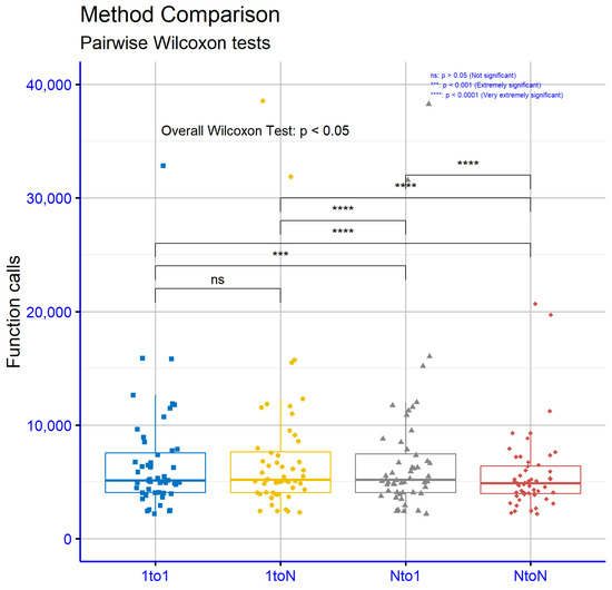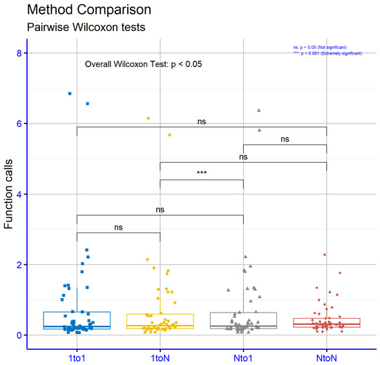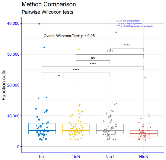 In Figure 4, the statistical results from the comparison of information propagation strategies among subpopulations, based on the critical parameter p (levels of statistical significance), reveal significant differences in the effectiveness of the methods. The comparison between the 1to1 and 1toN strategies yielded p = 0.36, a value exceeding the conventional significance threshold of 0.05, suggesting that these two approaches do not differ statistically significantly. However, the remaining comparisons show marked differences. For example, the comparison of 1to1 vs. Nto1 (p = 0.00086) and 1to1 vs. NtoN (p = 7.3 ) demonstrate very high statistical significance, meaning the Nto1 and NtoN strategies differ dramatically from 1to1. The comparisons 1toN vs. Nto1 (p = 7.3 ) and 1toN vs. NtoN (p = 2.6 ) confirm that strategies involving multiple subpopulations (Nto1, NtoN) are statistically superior to 1toN. Finally, the comparison Nto1 vs. NtoN (p = 2.1 ) indicates that even between these two strategies, there is a significant difference, with NtoN standing out as the most distinct method.