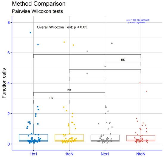 In Figure 5, the statistical results from the comparison of propagation strategies among subpopulations, based on the critical parameter p, reveal variations in the significance of differences. The comparison between 1to1 and 1toN yielded p = 0.53, a value above the 0.05 significance threshold, suggesting no statistically significant difference between these strategies. Similarly, the comparisons 1to1 vs. Nto1 (p = 0.097) and 1toN vs. Nto1 (p = 0.16) show values above 0.05, though close to the threshold, without confirming statistical significance. However, the comparison of 1to1 vs. NtoN resulted in p = 0.04, a value below 0.05, indicating a statistically significant difference between these strategies. Additionally, the comparison of Nto1 vs. NtoN (p = 0.05) lies exactly at the significance threshold, which could be interpreted as suggestive of a difference. The comparison of 1toN vs. NtoN (p = 0.066) approaches the threshold but does not exceed it. These findings suggest that the NtoN (all-to-all) strategy appears to differ significantly from 1to1, while differences between other strategies are less pronounced or uncertain. This may imply that NtoN offers unique advantages compared to other approaches, though further investigation is needed to confirm its behavior across diverse scenarios. The presence of values near the significance threshold (e.g., 0.05–0.066) highlights the need for larger sample sizes or more sensitive analytical methods to clarify these borderline results.