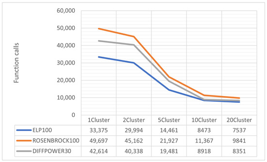 Comparison of function calls of ELP, ROSENBROCK and DIFFPOWER with different numbers of clusters.