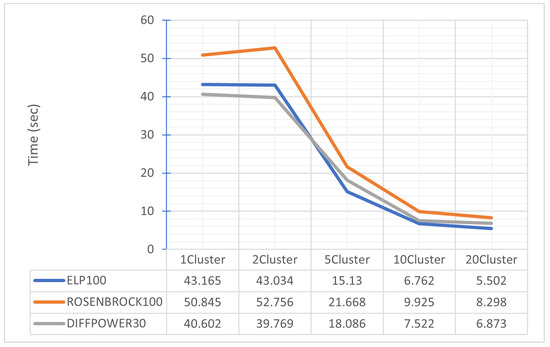 Comparison of times of ELP, ROSENBROCK, and DIFFPOWER with different numbers of clusters.