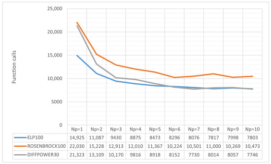 Figure 10 presents the results of the parallel SAO method for the same functions with varying values of the parameter (number of agents). For all functions, a general decrease in function calls is observed as increases, though the improvement is nonlinear. For instance, in ELP100, calls drop from 14,925 ( = 1) to 7803 ( = 10), with the sharpest decline occurring between = 1 and = 5 (14,925 to 8473). Similarly, ROSENBROCK100 reduces calls from 22,030 ( = 1) to 10,473 ( = 10), albeit with fluctuations (e.g., an increase to 11,000 for = 8). DIFFPOWER30 shows the greatest relative improvement, with calls decreasing from 21,323 ( = 1) to 7746 ( = 10), particularly sharply between = 1 and = 7. The differences in behavior across functions suggest that optimization efficiency depends on the problem’s inherent characteristics. ELP100 benefits more significantly from increasing agents, while ROSENBROCK100 exhibits greater instability, likely due to its higher complexity. Additionally, for > 5, reductions in calls are slow, possibly indicating limits in parallel processing efficiency or increased computational coordination costs among agents.