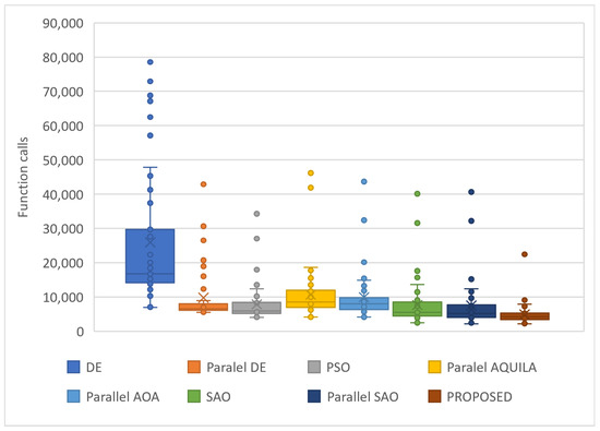 Figure 11 expands on this analysis with box plots illustrating the statistical distribution of function calls. The pSAOP exhibits the most compact box plot, with a lower median and narrower range compared to the other methods. This indicates that pSAOP not only reduces the mean number of calls but also minimizes result variance, ensuring more predictable performance. Despite the presence of some outliers, the overall trend confirms that pSAOP is the most efficient choice for parallel optimization, especially in large-scale problems. The introduction of dynamic information exchange mechanisms between subpopulations (e.g., NtoN) appears to be the key factor driving this improvement, balancing exploration and exploitation within the search space.