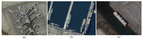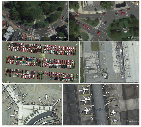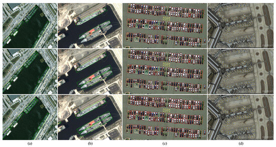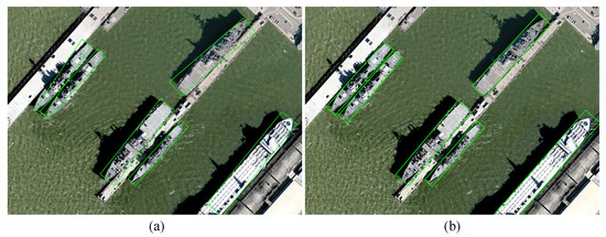 Most deep learning-based OD algorithms have matured within the domain of natural image tasks, where HBBoxs are commonly used as the annotation format. However, when such models are directly applied to RSI scenarios involving arbitrarily oriented and densely packed objects, detection performance often becomes constrained. OOD methods have partially alleviated these limitations. As depicted in Figure 3a,b, compared with HBBox, OBBox offers three key advantages in RS contexts [36]: (1) it more accurately reflects the true aspect ratio of the object; (2) it more effectively distinguishes objects from the background region; and (3) it helps to separate adjacent objects arranged in dense patterns. Figure 4 further demonstrates the differences between HBBox and OBBox annotations, highlighting the importance of OOD in RSI analysis.
