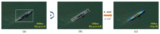 This formulation has clear geometric and physical interpretation: the mean vector indicates the central position of the object region; the diagonal elements of the covariance matrix reflect the scale of the object along the x and y axes, which are proportional to the squared width and squared height , respectively; and the off-diagonal elements describe the coupling relationship along the object’s orientation, determined by the rotation angle , thereby capturing the orientation structure of OBBox.