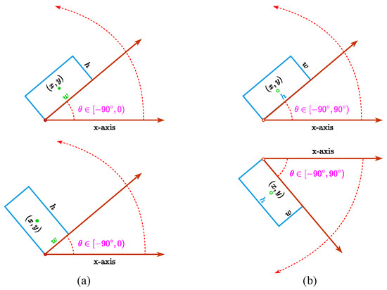 Unlike HBBox, OBBox is generally represented by five parameters. The mainstream definitions include the OpenCV convention () and the long-edge-based convention (), as shown in Figure 4. The five-parameter format is expressed as , where denotes the center of the OBBox. In the definition, w and h correspond to the first and second edges coinciding with the x-axis after clockwise rotation, and the rotation angle lies within the range . In contrast, the definition assigns w and h to the shorter and longer edges of the BBox, respectively, and the corresponding angle falls within .