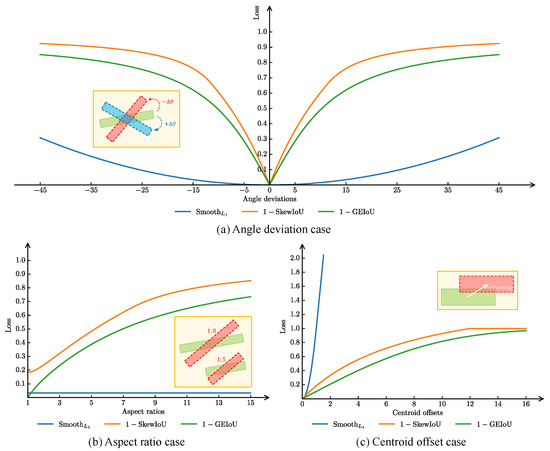 In OD tasks, IoU is a commonly used evaluation metric, whereas standard localization losses—such as the widely used in OOD—belong to the family of normalized norm-based losses (), leading to a degree of inconsistency between the two [32,33]. This inconsistency is further amplified in OOD due to the introduction of angle parameters. As illustrated in Figure 5, the SkewIoU metric and loss exhibit significant differences in their trends under the following three conditions: