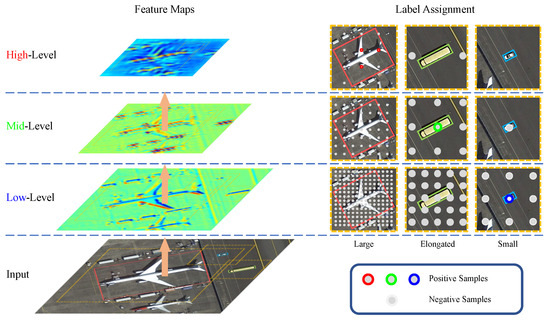 As shown in Figure 6, fixed-scale LA strategies exhibit significant sampling insufficiency when encountering objects with extreme scales (e.g., large aircraft and small vehicles). Due to the constraint of fixed scale thresholds, only a limited number of positive samples can be obtained from certain feature pyramid layers. Even if there are sample points located within the GT box on other layers, they are still treated as negative samples if their scales do not meet the predefined threshold, thus limiting the spatial coverage of positive samples.