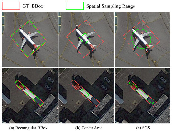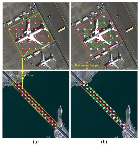 In terms of spatial assignment, current LA strategies primarily adopt rectangular BBox regions as sampling areas, as shown in Figure 7a, which introduces substantial background noise near the object boundaries. To improve the quality of positive samples, methods such as Adaptive Object Proposal Generation (AOPG) [40] adopt center-focused sampling strategies, selecting points closer to the object center to enhance the training signal. However, these approaches fail to adequately consider the pronounced aspect ratio variations in RS objects, leading to the misclassification of sample points within the actual object region as negative samples, as illustrated in Figure 7b. This issue is particularly evident for extremely large or high-aspect-ratio objects, exacerbating the sampling insufficiency.