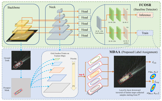 To address the limitations of existing LA strategies that inadequately account for the geometric characteristics of RS objects and thereby restrict detection performance, this study constructed an RSOD model based on an adaptive LA strategy. To validate the effectiveness and robustness of the proposed strategy, a simplified anchor-free detector was adopted as the baseline model. Compared with FCOS, the Fully Convolutional One-Stage Rotated detector (FCOSR) [41] removes the centerness prediction branch, resulting in a more concise and efficient network structure that consists solely of a classification branch and a regression branch, making it suitable for OOD tasks. The overall model architecture is illustrated in Figure 8.