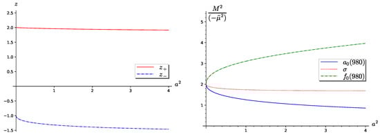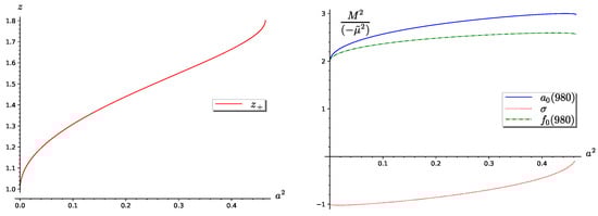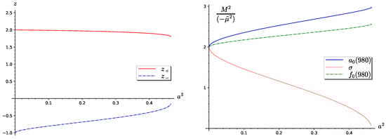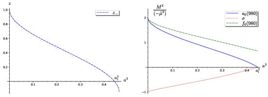 The second case, solution (29), is illustrated in Figure 4. The left panel of the figure presents the solutions of Equation (24). Again, only solution is positive. The right panel presents the reduced squares of the masses of the meson isotriplet and the two isosinglets. This result is more attractive from a physical point of view. Namely, for , the masses of the isotriplet and isosinglet are almost degenerate and heavy, while the meson mass tends to zero, and it equals zero for . From Equation (25), it follows that for the case , the parameter a is positive: . So, for the second case, the mass ratio . This mass ratio depends on the initial coupling constants in the Lagrangian (1) and this means that is greater than .