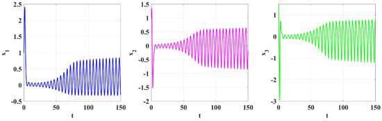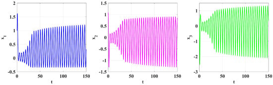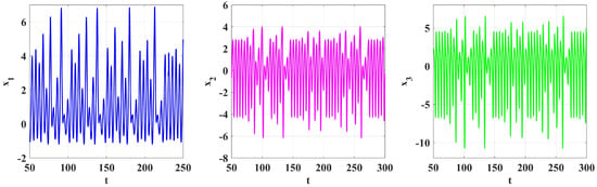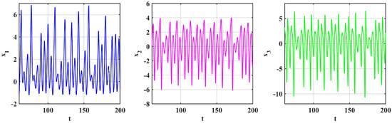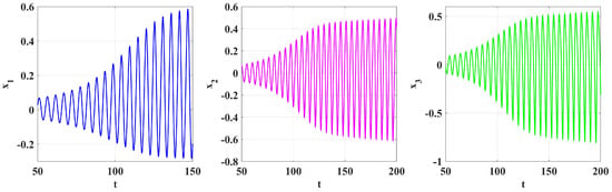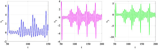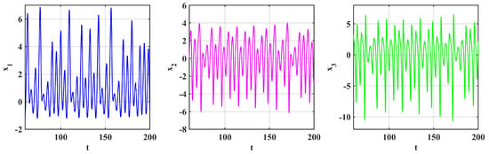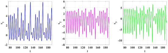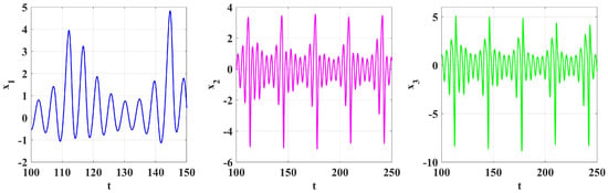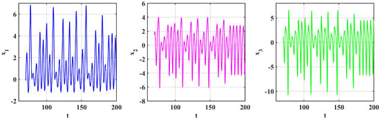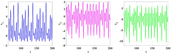 Figure 16, Figure 17, Figure 18, Figure 19, Figure 20, Figure 21 and Figure 22 exhibit novel chaotic and dynamic patterns in a time-varying parameter-dependent system, , , and . Parameterizations add nonlinearity and time modulation and lead to complex phase portraits and oscillatory time-series patterns. The phase-space chaotic attractors have complex shapes and densities, which represent sensitivity to the initial conditions and parameter variations. The time series plots also determine transitions from chaotic to periodic behavior, with the oscillations increasing or stabilizing with time. This task is particularly novel, as it combines nonlinear dynamics with time-varying parameters and offers insight into complex systems like biological rhythms or climate models. The dynamics that arise between periodicity and chaos emphasize the system’s rich and unstable dynamics.