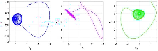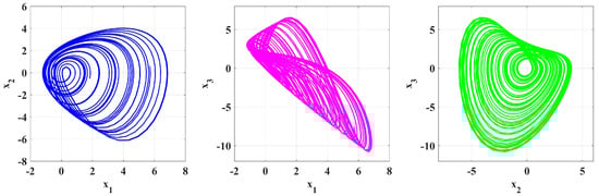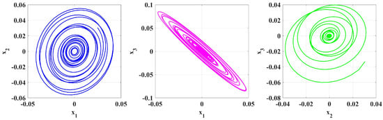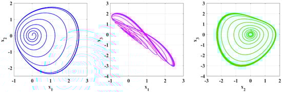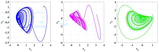 This section explains how system dynamics change with a difference of . The plots in Figure 1, Figure 2, Figure 3, Figure 4, Figure 5, Figure 6, Figure 7, Figure 8, Figure 9, Figure 10, Figure 11 and Figure 12 are the dynamics of a dynamical system for various parameter settings and functional forms of . The phase space plots (first rows) provide the trajectories for different planes (-, -, -), and the time series plots (bottom rows) show the time evolution of the system variables (, , ). Time-varying results in a great deal of chaos and complexity, as seen in Figure 1, Figure 5, and Figure 9 with , , and , respectively. These functional forms create chaotic oscillations and random trajectories, with chaotic behavior dominating for tangent modulation. On the other hand, sustained (e.g., in Figure 2, in Figure 6, and in Figure 10) results in periodic and stable dynamics, characterized by smooth closed orbits in phase space and recurrent oscillations in the time series. Logistic growth Figure 5 displays convergence to stability from chaotic dynamics that asymptotically approaches a constant.
