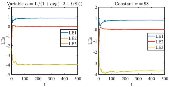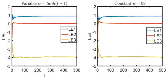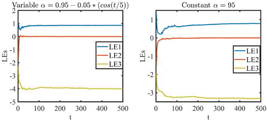 The time evolution of Lyapunov exponents (LE1, LE2, LE3) of variable and constant fractional orders is presented in Figure 23, Figure 24 and Figure 25. Variable fractional orders, in all three cases, exhibit more intense transient behaviors compared to their constant counterparts because they are time-varying. In Figure 23, gives periodic oscillations, with LE1 settling at close to , LE2 at 0, and LE3 at approximately . Similarly, in Figure 24, with , LE1 settles just above , with continuing chaos, while LE2 and LE3 settle at 0 and , respectively. Figure 25, with , illustrates the same stabilization, as LE1 is chaotic, LE2 has quasiperiodic behavior, and LE3 shows contraction in some dimensions of the attractor. In all the figures, the fractional orders that are fixed stabilize faster than variable ones, but the asymptotic behavior is the same. LE1 is positive in both cases and indicates chaotic dynamics, LE2 approaches 0, and LE3 approaches a negative value, indicating state-space contraction. Variable orders (oscillatory cosine, exponential sigmoid, and hyperbolic tangent) affect the transient behavior but ultimately approach behavior similar to the constant fractional order systems. These results demonstrate the equivalence of fractional-order variability with system stability and introduce knowledge on how chaos or stability can be regulated in dynamical systems.