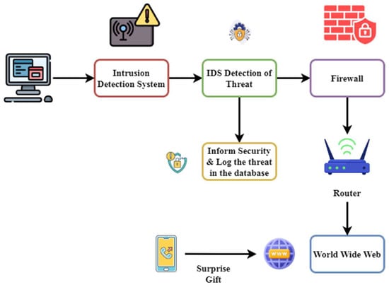 Figure 1 illustrates a general conceptual overview of how a traditional IDS operates within a network environment. In a network, a collection of computers is connected, and the IDS is crucial in identifying negative behavior. The IDS informs security personnel and logs the incident into a database for further investigation when it discovers a threat. Managing data traffic between the internal network and the World Wide Web, the firewall acts as the next barrier of defense, filtering unauthorized access before it arrives at the router. Captivatingly, the design features a surprise gift that results in a mobile device, maybe hinting at unexpected online assaults like phishing or malware.