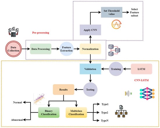 Figure 2 illustrates a sequential hybrid architecture that integrates CNN and LSTM networks for an IDS. In this design, the CNN first extracts spatial features from the input data, which are then processed by LSTM networks to capture temporal dependencies within those features. This paper introduces a hybrid DL architecture combining CNN and LSTM, applied to the NSL-KDD and WSN-DS datasets. The process begins with data pre-processing, encompassing data cleaning, feature extraction, normalization, and CNN-based feature selection to emphasize significant attributes. A pre-defined threshold is established, enabling the selection of a refined feature subset for further analysis. Subsequently, LSTM networks take precedence, effectively handling the sequential nature of the data. The model is trained, verified, and tested to obtain optimal performance. Two approaches are finally used in classification: Binary categorization lets one distinguish between normal and abnormal activities. Type 1, Type 2, and Type N attacks constitute multiclassification. This architecture increases intrusion detection accuracy, enabling real-time cybersecurity threat identification and reducing unnecessary action.
