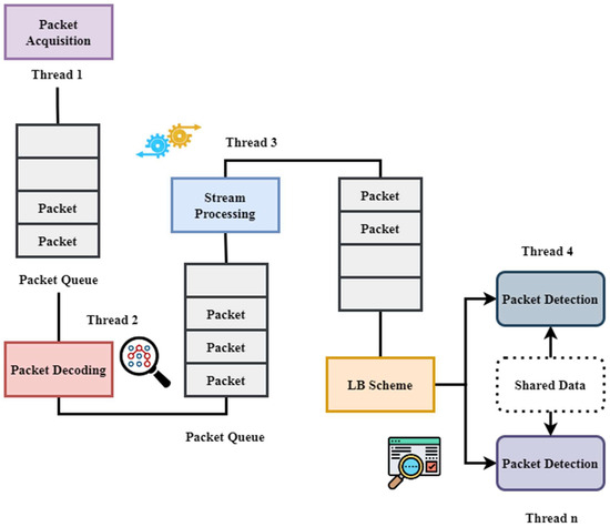 While maintaining excellent detection accuracy, using ResNet–LSTM for sequential pattern learning and autoencoders for anomaly detection helps significantly reduce false positives. Figure 3 presents a multi-threaded packet processing technique for controlling network traffic. Thread 1, starting the operation, gathers incoming packets from lines of packet acquisition. Pulling relevant data, Thread 2 packet decoding prepares data for future usage. Refining the data flow and stream processing Thread 3 ensures ordered packet treatment. Thread 4 through Thread n distributes packet processing among many packet detection threads under the load-balancing (LB) scheme. These threads enable efficient identification and analysis of network packets employing data transmission. This method ensures scalability and parallelism for real-time network monitoring, optimizing performance. Shared data applied across detection threads enhance fast threat identification and accuracy.