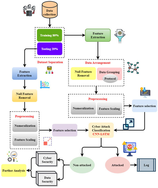 The increasing importance of quantum computing in cybersecurity makes this omission significant. Quantum algorithms, such as quantum support vector machines (QSVM) and quantum k-nearest neighbors (QKNN), can improve anomaly detection by using quantum parallelism to analyze high-dimensional data more effectively than conventional methods. Furthermore, quantum optimization methods may decrease training duration, enhance detection precision, and minimize false positives. Using the NSL-KDD dataset, Figure 4 presents a systematic strategy for cyberattack identification and classification. It assigns 20% for testing and 80% for training, starting with dataset separation. The cyber-attack training phase consists of pre-processing (numeralization and feature scaling using UV-Scaler), data organization (null feature removal and protocol-based grouping), and feature extraction. The testing phase follows a like-minded path employing pre-processing, feature extraction, and null feature elimination [30]. Non-attacked data are handled for cyber security and data security (PXORP-ECC); attacked data are recorded for further investigation.