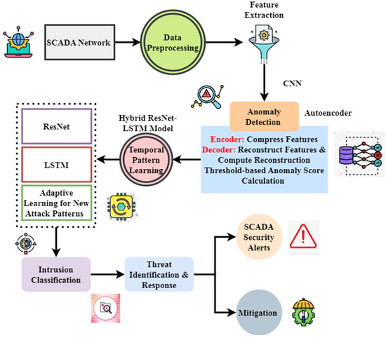 The framework provides exceptional cybersecurity for critical infrastructure, particularly SCADA systems, by quickly detecting network anomalies and malicious activity and addressing unique vulnerabilities. Originally designed to guard SCADA systems against cyberattacks, the innovative IDS known as the HAE–HRL framework (Figure 5), DL mixed with anomaly detection, improves security monitoring. The process begins with data preparation assured of consistent and clean input. After the prominent network characteristics are extracted, a CNN detects deviations via autoencoder reconstruction of normal patterns. Then, a hybrid ResNet–LSTM model enables the system to be flexible enough to meet changing threats by capturing temporal attack patterns. “Adaptive learning for new attack patterns” refers to the continuous model enhancement process, where the system incrementally retrains or fine-tunes the CNN–LSTM model using recently captured anomalies or zero-day attack features. This ensures that the detection model evolves and maintains its efficacy against emerging threats.
