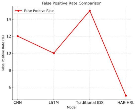 Figure 6 highlights the false-positive rates of models. HAE–HRL has the lowest (5%), ensuring fewer incorrect alerts. The hybrid model was trained on the NSL-KDD dataset using an NVIDIA RTX 3090 GPU (Santa Clara, CA, USA), was sourced locally in Saudi Arabia, with 20 GB VRAM, 64 GB RAM, and an Intel i9-12900K processor. The total training time for 50 epochs was 3 h and 45 min, with an average epoch duration of 4.5 min. To optimize this, we utilized multi-threaded packet processing, which reduced pre-processing time by 35% compared to single-threaded baselines. Our primary experiments were conducted on the aforementioned high-performance setup. However, recognizing the resource constraints in industrial SCADA environments, we tested the model on an NVIDIA Jetson TX2. Future work will focus on reducing computational overhead and benchmarking real-time performance in industrial environments.