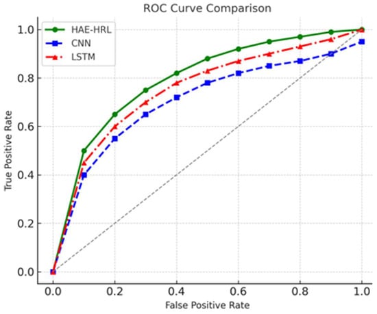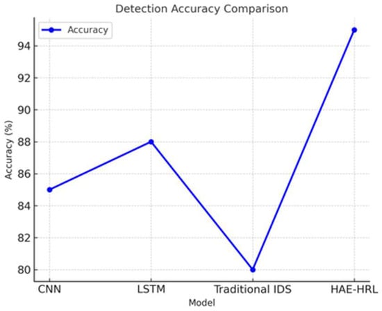 Figure 8 shows the accuracy of different models in detecting anomalies. HAE–HRL achieves the highest accuracy (95%), outperforming CNN, LSTM, and a traditional IDS.