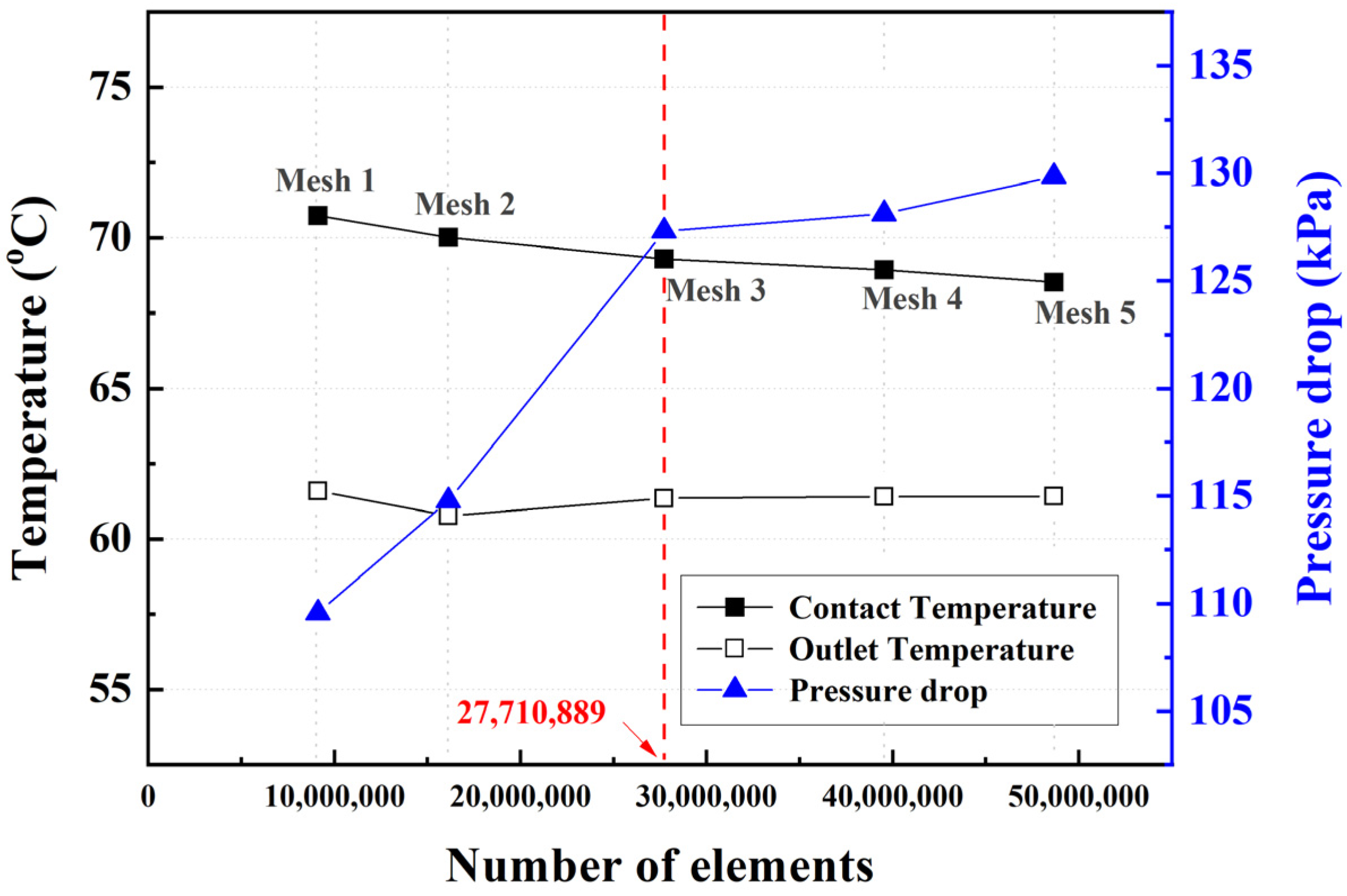 To ensure the reliability of the numerical simulations, a mesh independence study was performed by generating five different mesh configurations. The number of mesh elements and the corresponding simulation results for each case are presented in Figure 3. As the mesh was refined from Mesh 3 to Mesh 4, the observed differences in temperature and pressure drop were 1.86% and 0.67%, respectively. However, this refinement resulted in a significant increase in computational cost, with the simulation time increasing by more than 1.3 times. Given this trade-off between solution accuracy and computational efficiency, Mesh 3 was selected as the optimal configuration for further analysis, as it provided a balance between numerical accuracy and computational feasibility.