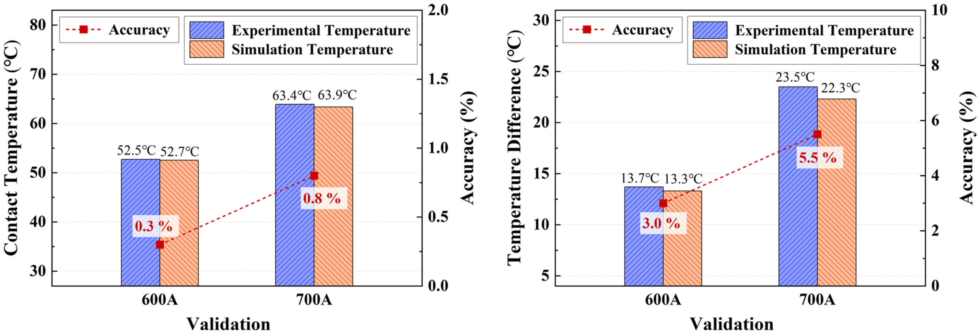 The validation between the numerical and experimental results is shown in Figure 6. The validation between the simulation results and experimental measurements for the 5 m-long cable core under 600–700 A current demonstrated a maximum deviation of 0.8% in contact temperature and 5.5% in the coolant inlet–outlet temperature difference. Given that the maximum error remained within 6%, the numerical model was deemed to exhibit high reliability, thereby validating the accuracy and effectiveness of the computational analysis.