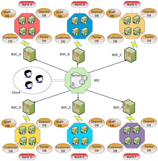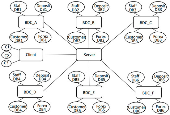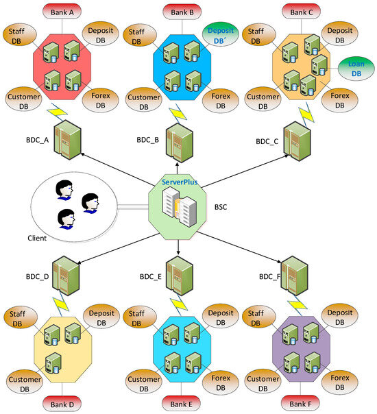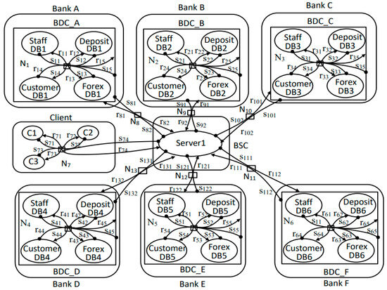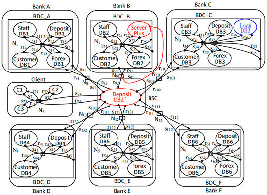 The original structure of the bank data service system and the software architecture diagram are, respectively presented in Figure 1 and Figure 2. We are now using Extended Bigraph to model its software architecture. As shown in Figure 15, the Bigraph model of the software architecture of the bank data service system includes eight domains, namely Bank A, Bank B, Bank C, Bank D, Bank E, Bank F, BSC, and a virtual location for the Client. Each Bank i has a data center server component BDC_i deployed separately, and each data center server manages and deploys four types of database server components: Staff DBi, DepositDBi, ForexDBi, and CustomerDBi. This is represented as a nested relationship of virtual locations in the Bigraph model. A powerful control server component, Server1, is deployed in the BSC, and there are three types of clients C1, C2, and C3 in the Client. These components are connected through connectors Ni, and communication between components is performed through dual transceiver ports (si, ri), which are represented as dual tentacles on Bigraph as super-edges.