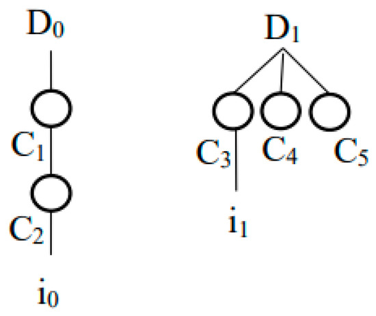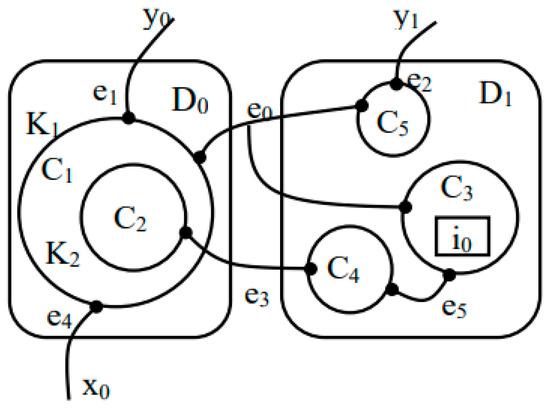 Bigraph is a graphical formal theoretical method [25], which was proposed by Robin Milner, a Turing Award winner in 2001. Bigraph has two goals: (1) modeling for pervasive computing systems; (2) building unified meta models for existing mobile and concurrent theories. A Bigraph is composed of a place graph (BP) and a link graph (BL), denoted as B = (BP,BL). Bigraph is based on the mathematical theory of s-category. In bigraph, the interface is regarded as an object and the graph is regarded as a morphism. Figure 3 is an instance of bigraph, denoted as B: <1,X>→<2,Y>, where → represents a morphism. <2,X> represents an inner interface, in which 1 denotes this bigraph has one site, that is, i0; X denotes bigraph B has an inner name set {x0}. <2,Y> represents an outer interface, where 2 denotes that this bigraph has two domains, that is, D0 and D1; Y denotes that bigraph B has an outer name set {y0,y1}. BP is the place graph of bigraph B, as shown in Figure 4, denoted as BP:1→2. BL is the link graph of bigraph B as shown in Figure 5, denoted as BL: X→Y. In order to enhance the ability of expression, the concept of basic signature is added into bigraph. Basic signature is characterized by a dual tuple (K, mp), where K is the control set,, and n is the arity of k and N is the set of natural numbers. Any k, has a map, denoted as , which means the mapping of K to N. In other words, basic signature of bigraph is that each node is assigned a control k, and the arity n of control k is the port number of each node and n is usually represented by little black dots as depicted in Figure 1. Thus, the bigraph can be further denoted as B = (BP,BL) = (V,E,Ctrl,Prnt,Link): <m,X>→<n,Y>, where BP = (V,Ctrl,Prnt): m→n and BL = (V,E,Ctrl,Link): X→Y. V represents a finite set of nodes. E represents a finite set of edges. Ctrl:V→K represents the mapping of node V to control K. Prnt: mv→vn is the parent mapping. Link: XO→EY is the link mapping. X is the set of inner names. n is the number of outer regions. Y is the set of outer names.