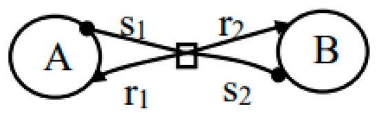 In order to effectively model the connector and port in the software architecture, the edge connecting two nodes in Bigraph needs to be extended. In the original Bigraph, two nodes are connected by a super edge with only two tentacles, as shown in Figure 7. We need to extend it to the super edge of four tentacles, two of which are connected to one node and the other two to another node. For example, the connection of the two nodes shown in Figure 8 is extended to the connection of the two nodes shown in Figure 8. It is worth noting that these four tentacles have directional semantics. More specifically, they are two pairs of ports with dual semantics. As shown in Figure 8, s1 and r1 are a pair of sending and receiving ports, s2 and r2 are another pair of sending and receiving ports. Similarly, Figure 9 shows the connection of three nodes.