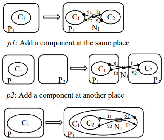In the big data-oriented software architecture, for adding a component, not only the link between the added component and other components, but also the place of the added component should be considered. Therefore, we design three basic add evolution rules, as shown in Figure 11. Evolution rule p1 denotes that there is already a component C1 in place P1. Now it is necessary to add a component C2 in the same place and add the corresponding link N1 to connect the two components. For example, in a big data distributed system, there is already a data node C1 within a certain bank P1, and now it is necessary to add another data node C2. Evolution rule p2 denotes that there are already places P1 and P2, and a component C1 in place P1. Now it is necessary to add a component C2 in the place P2 and add the corresponding link N1 to connect the two components. For example, in a big data distributed system, one bank P1 already has a data node C1, and now it is necessary to add a data node C2 in bank P2. Evolution rule p3 denotes that there is already a component C1 in place P1. Now it is necessary to add a component C2 in the component C1 and add corresponding link N1 to connect the two components. For example, in a big data distributed system, there is already a data node C1 within a bank P1, and now it is necessary to add a security protection node C2 within the data node C1. We also can express it with the term expression in Bigraph, as follows.