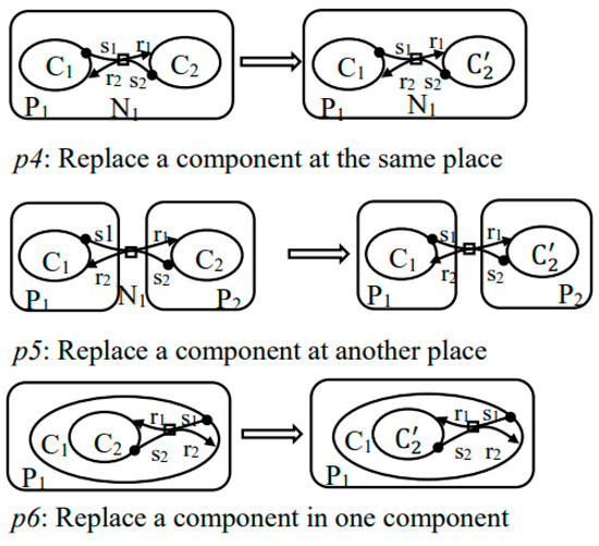To the replace evolution rule, we also design three basic replace evolution rules, as shown in Figure 12. Evolution rule p4 denotes that there are already two components C1 and C2 in place P1, and the corresponding link N1 to connect the two components. Now it is necessary to replace component C2 with , and the other parts remain unchanged. For example, in a big data distributed system, there are two data nodes C1 and C2, within a bank of P1, and now it is necessary to replace data node C2 with . Evolution rule p5 denotes that there are already two components, C1 and C2, in the place of P1 and P2, respectively, and the corresponding link N1 to connect the two components. Now it is necessary to replace component C2 with , and the other parts remain unchanged. For example, in a big data distributed system, spanning two banks, P1 and P2, there is a data node C1 within one bank, P1, and the no data node, P2. Now, it is necessary to add a data node C2 within P2. Evolution rule p6 denotes that there are already two components C1 and C2 in place P1, and C2 is in C1, and the corresponding link N1 to connect the two components. Now it is necessary to replace component C2 with , and the other parts remain unchanged. For example, in a big data distributed system, there is a data node C1 in bank P1, and there is a security protection node C2 inside the data node C1. Now it is necessary to replace the security protection node C2 with . We can also express it with the term expression in Bigraph, as follows.