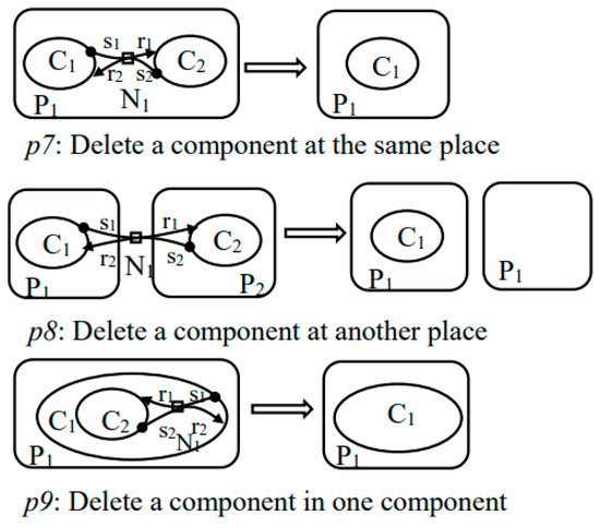 To the delete evolution rule, we also design three basic replace evolution rules, as shown in Figure 13. Evolution rule p7 denotes that there are already two components, C1 and C2 in the place of P1, and the corresponding link N1 to connect the two components. Now it is necessary to delete component C2 and the corresponding link N1, and the other parts remain unchanged. For example, in a big data distributed system, there are two data nodes, C1 and C2, within a bank P1, and now it is necessary to delete data node C2. Evolution rule p8 denotes that there are already two components C1 and C2 in the place of P1 and P2, respectively, and the corresponding link N1 to connect the two components. Now it is necessary to delete component C2 and the corresponding link N1, and other parts remain unchanged. For example, in a big data distributed system, there are data nodes C1 and C2 in the two banks, P1 and P2, respectively. Now it is necessary to delete data node C2 in P2. Evolution rule p9 denotes that there are already two components C1 and C2 in place P1, and C2 is in C1, and the corresponding link N1 to connect the two components. Now it is necessary to delete component C2 and the corresponding link N1, and the other parts remain unchanged. For example, in a big data distributed system, there is a data node C1 within bank P1, and there is a security protection node C2 within the data node C1. Now it is necessary to delete the security protection node C2. We can also express it with the term expression in Bigraph, as follows.
