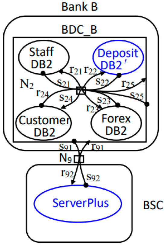 With the rapid development of online mobile technology, the demand for online loan services has surged significantly, necessitating the expansion of online loan business functions. To ensure safety, an online loan service application pilot will first be conducted at Bank C, with a view to extending it to the entire banking system once stable operations are achieved. By analyzing the logic of business functions, we have determined that a dedicated loan service database server needs to be added. Correspondingly, this requires the inclusion of a loan function component, which will exist in parallel with StaffDB3, DepositDB3, ForexDB3, and CustomerDB3 as a similar type of component. Given this scenario, we have chosen the evolution rule p1 to conduct a systematic Bigraph evolution upgrade. The corresponding section of the system’s Bigraph model after the addition of the loan function component is illustrated in Figure 16. For the sake of simplicity, only the evolutionary parts are presented here.
